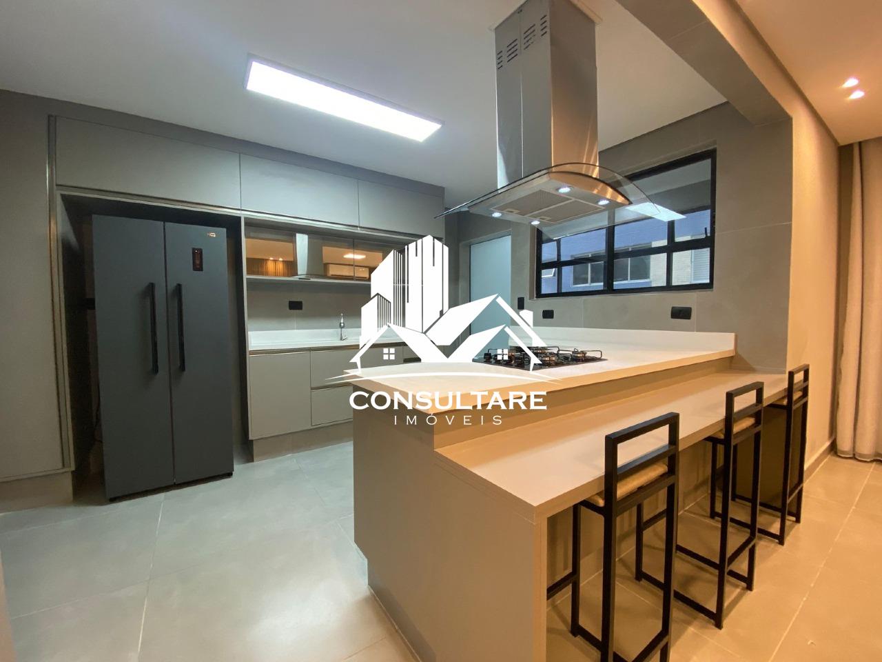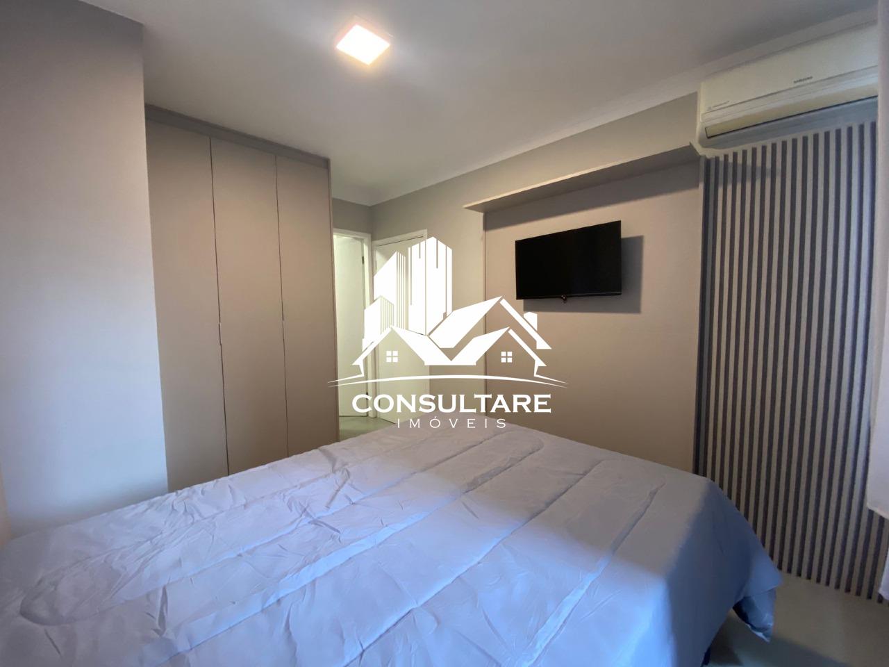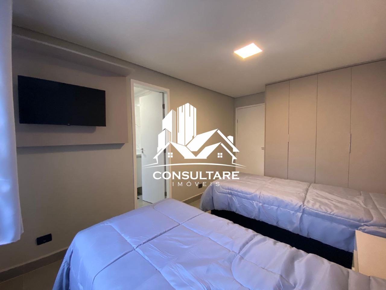 O apartamento dispõe de três suítes com armários planejados, camas, boxes e espelhos, proporcionando funcionalidade e conforto. A área social conta com sala ampla para dois ambientes integrada à cozinha americana, totalmente equipada com eletrodomésticos e mobiliário, criando um espaço moderno e acolhedor.