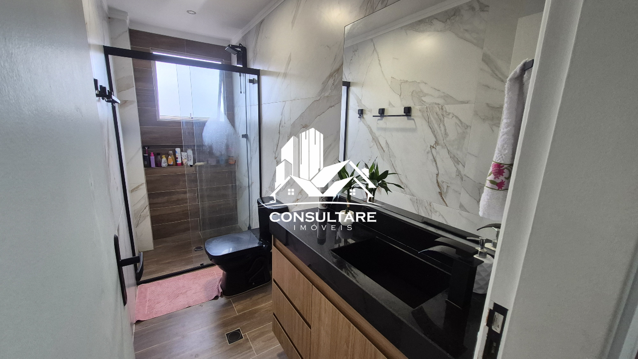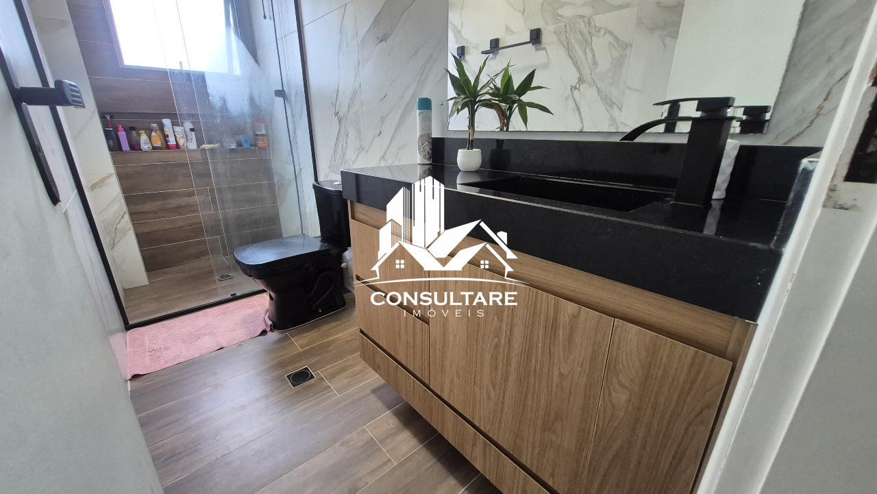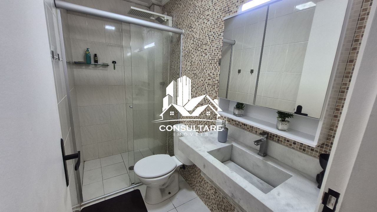 Banheiro social com box temperado e pia balcão com armário.