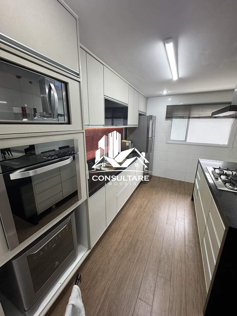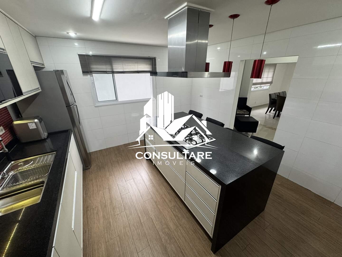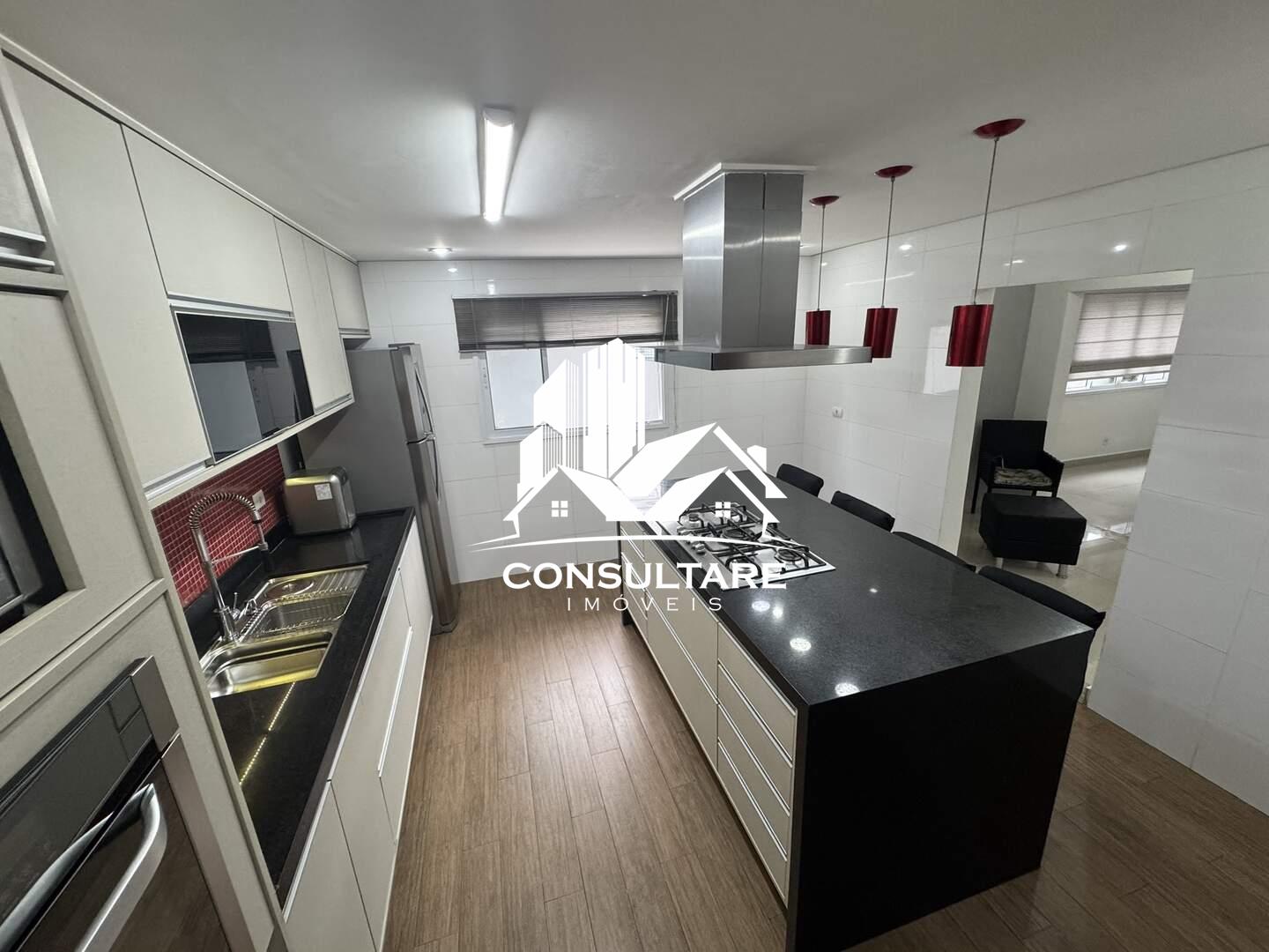 Cozinha completa com ilha e eletrodomésticos inclusos (cooktop, forno elétrico, lava-louças, exaustor, micro-ondas, geladeira e filtro de água)