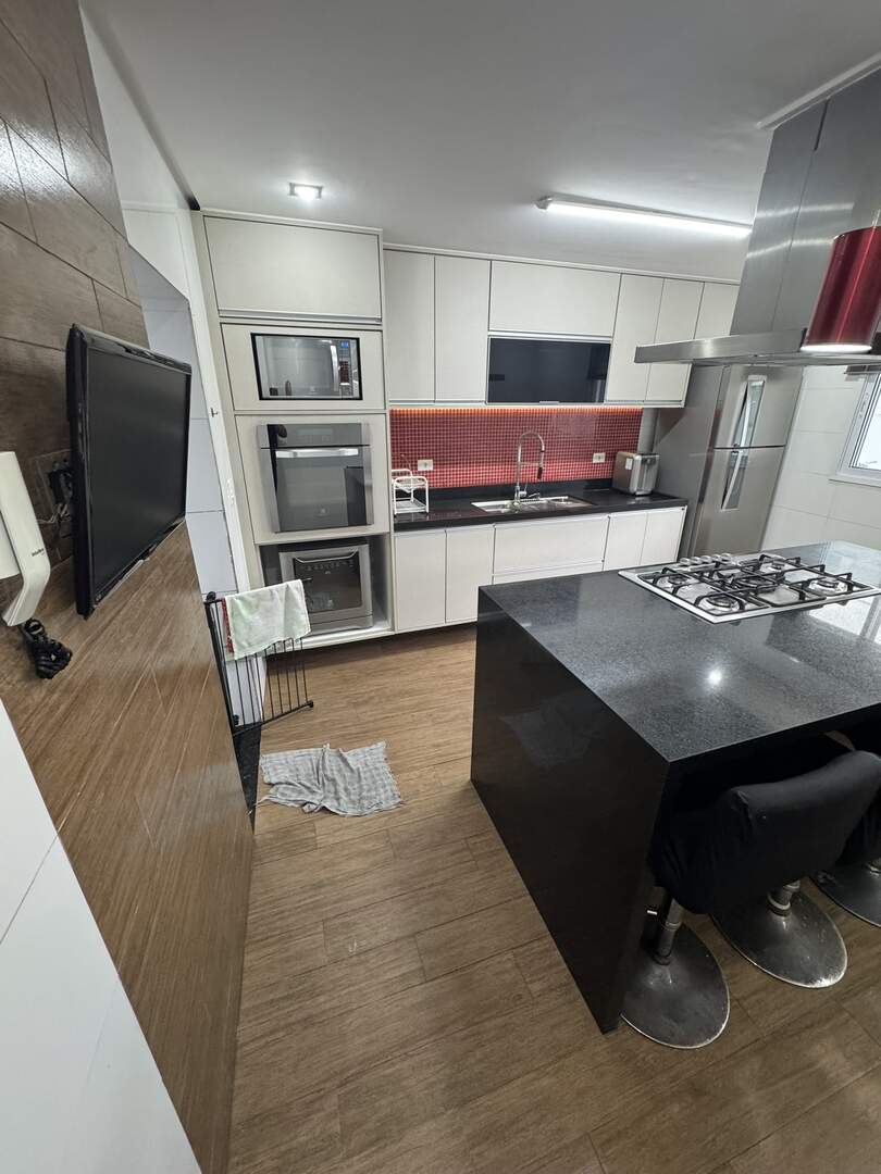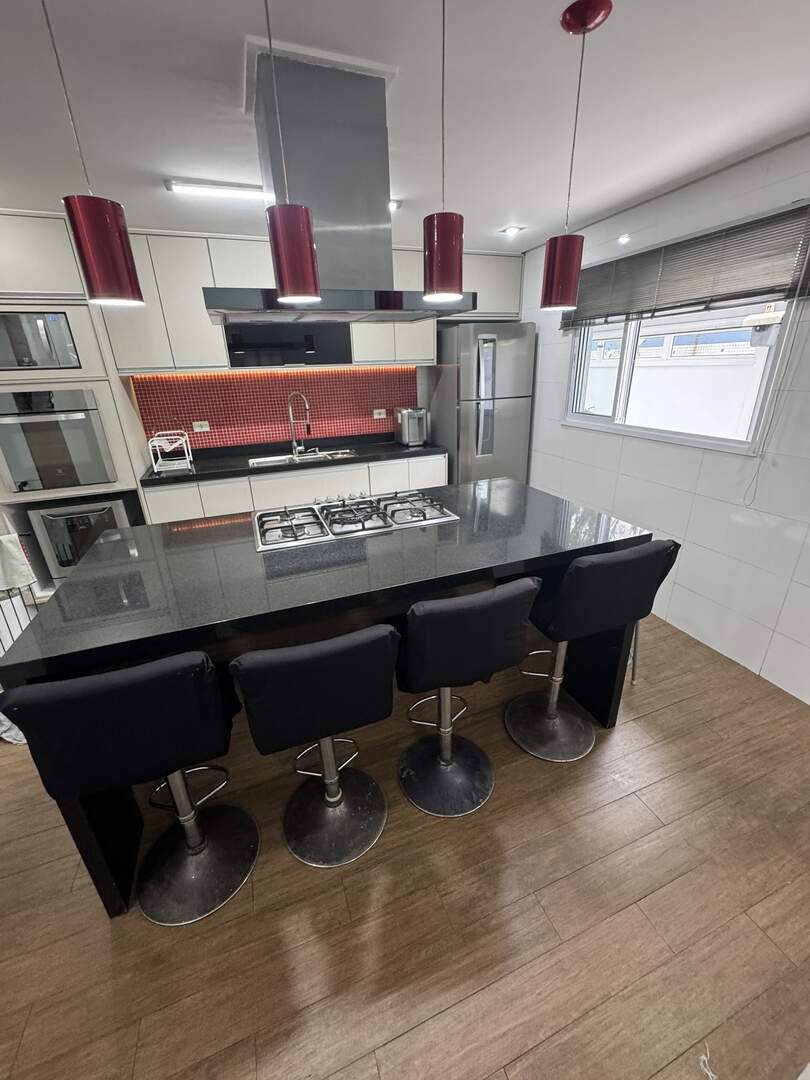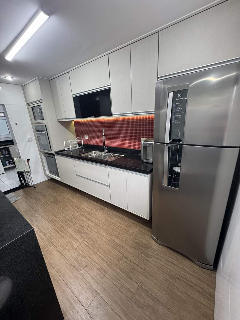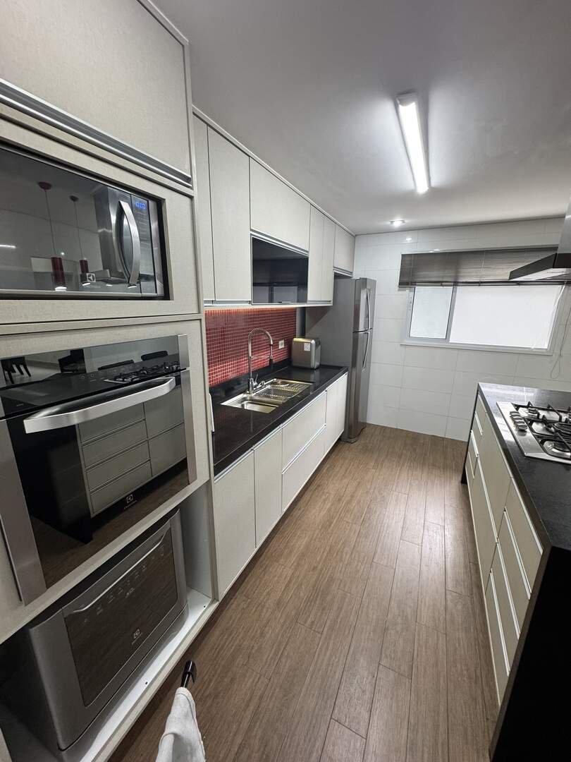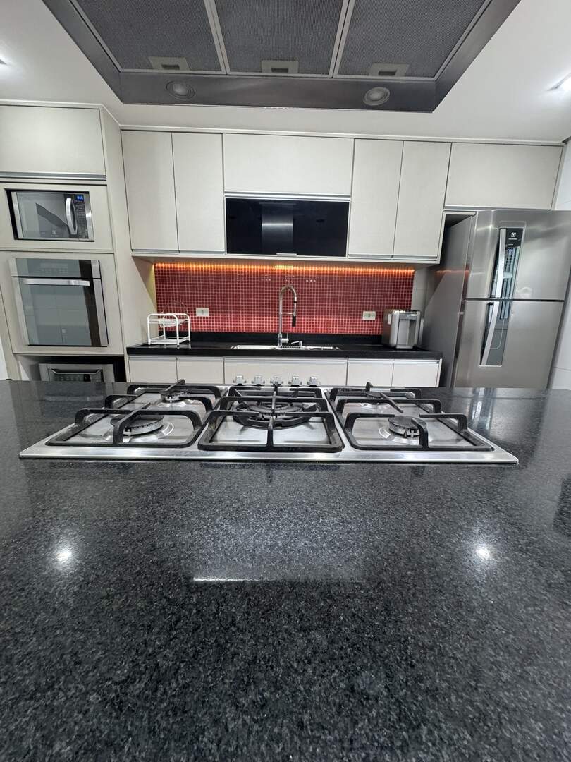 Cooktop, forno elétrico, lava-louças, exaustor, micro-ondas, geladeira e filtro de água.